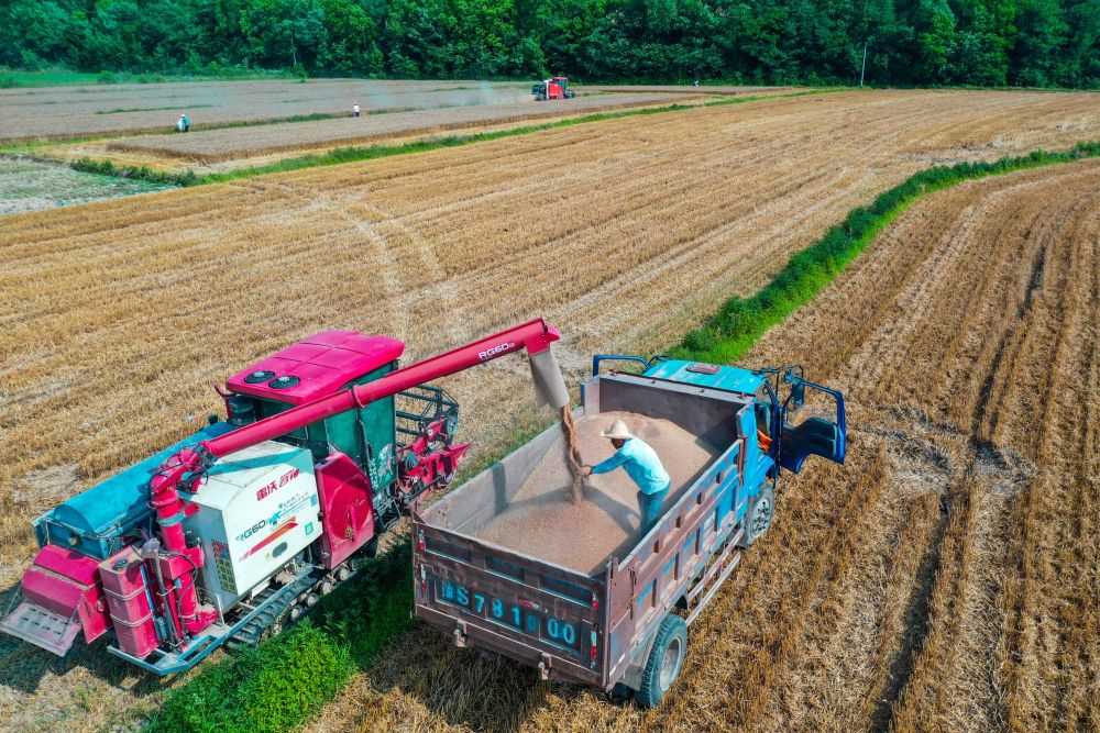 2024年6月1日,在河南省信陽(yáng)市光山縣南向店鄉(xiāng)何畈村鑫磊合作社,社員將收獲的小麥裝車(無(wú)人機(jī)照片)。新華社發(fā)(謝萬(wàn)柏?cái)z)
