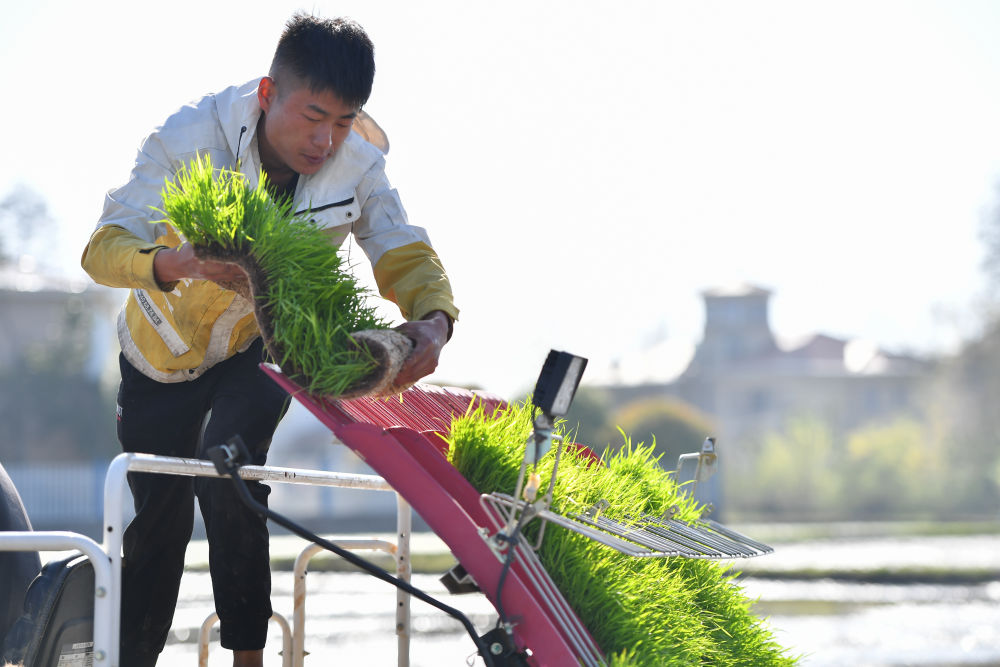 2024年3月29日,在湖南省長(zhǎng)沙市望城區(qū)高塘嶺街道沱市村,農(nóng)戶將秧苗放到插秧機(jī)上。新華社記者 陳澤國(guó) 攝
