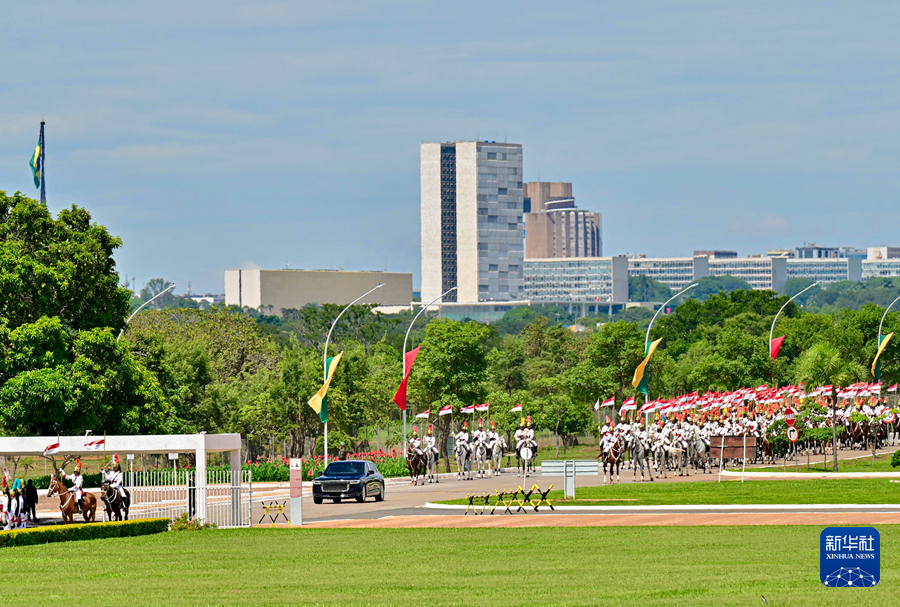 ??初夏時(shí)節(jié)的巴西利亞,天朗氣清。黎明宮內(nèi),綠草如茵,450名威武禮兵整齊列隊(duì)。在120名龍騎兵護(hù)衛(wèi)下,習(xí)近平乘車(chē)抵達(dá)黎明宮前廣場(chǎng)。