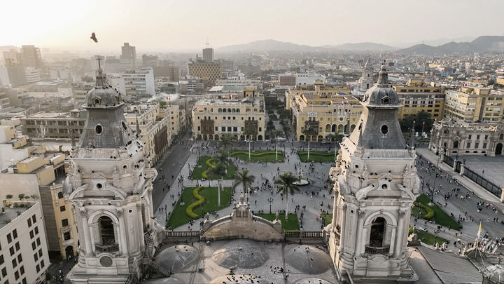 ??這是10月13日拍攝的秘魯首都利馬武器廣場(無人機(jī)照片)。新華社記者 李木子 攝