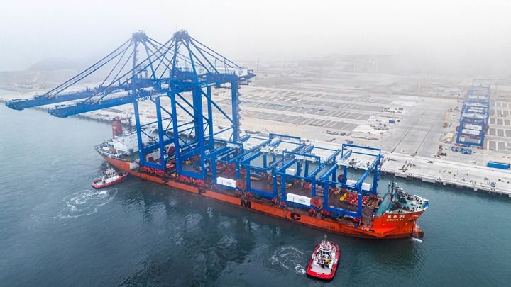??6月27日,岸邊集裝箱起重機(jī)和軌道吊運(yùn)抵秘魯錢凱港。新華社發(fā)(上海振華重工供圖)