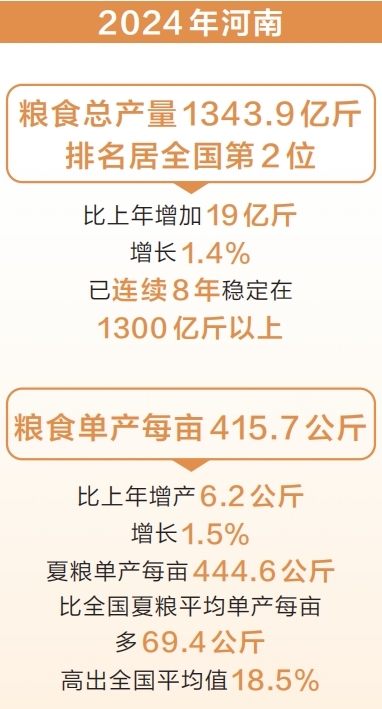 ??12月15日,記者獲悉,根據(jù)國家統(tǒng)計局河南調(diào)查總隊夏糧、秋糧產(chǎn)量抽樣調(diào)查樣本實割實測和糧食播種面積遙感監(jiān)測結(jié)果,經(jīng)國家統(tǒng)計局核定,2024年河南糧食總產(chǎn)量1343.9億斤,排名居全國第2位。河南糧食總產(chǎn)量已連續(xù)8年穩(wěn)定在1300億斤以上,為鞏固和增強(qiáng)經(jīng)濟(jì)回升向好態(tài)勢、推動高質(zhì)量發(fā)展提供了有力支撐。