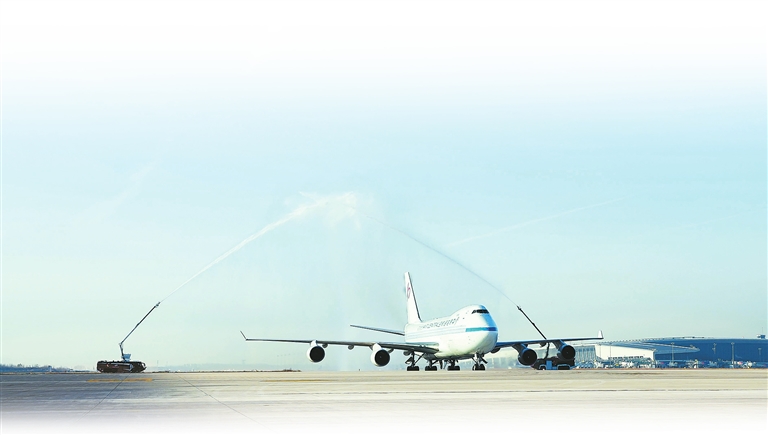 12月22日,中原龍浩航空B747全貨機從印度金奈飛抵鄭州,兩條銀色的水柱噴射而出,形成一座“水門”,向這架飛機致以民航界最高禮儀。 姚自力 攝