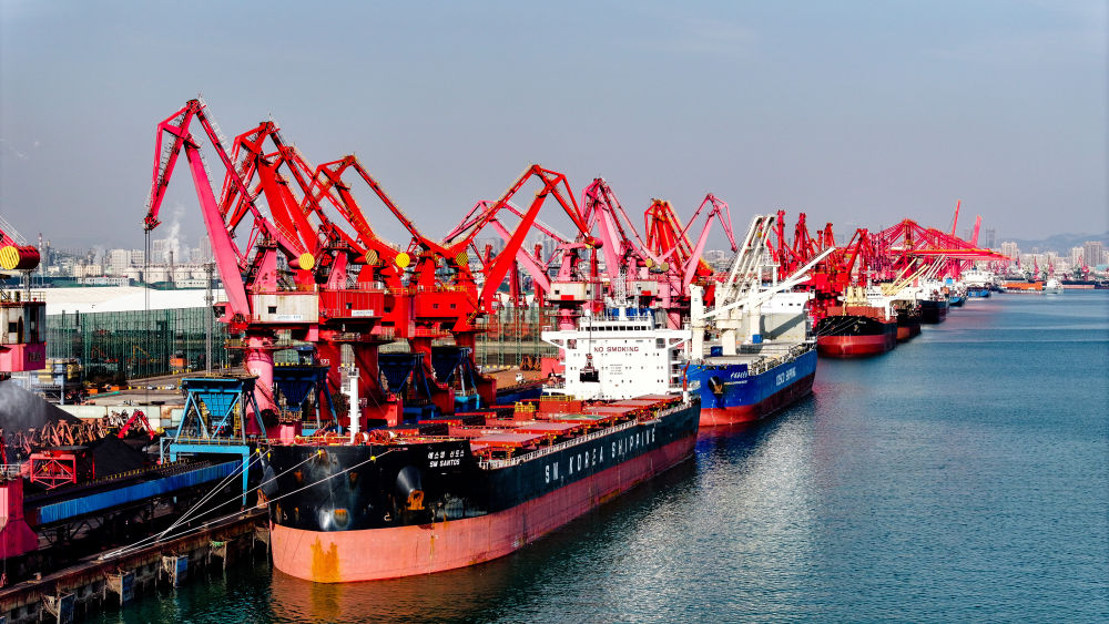 ??在山東港口日照港煤炭泊位,貨輪停泊卸煤(2024年12月4日攝,無人機照片)。新華社記者 郭緒雷 攝
