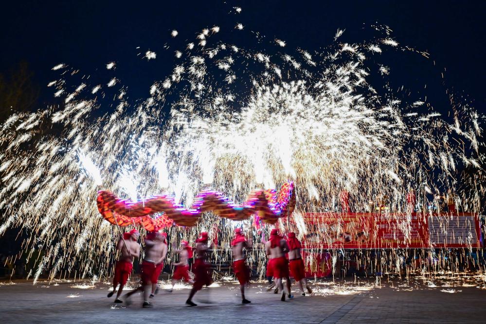 ??民間藝人在河南省洛陽市2024隋唐河洛文化廟會上表演打鐵花(2024年2月14日攝)。新華社發(fā)(李衛(wèi)超攝)