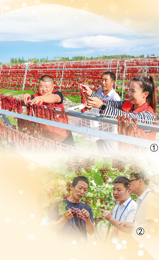圖①:新疆維吾爾自治區(qū)博湖縣塔溫覺(jué)肯鄉(xiāng)辣椒曬場(chǎng)上,黨員志愿服務(wù)隊(duì)幫助村民晾曬辣椒。 |